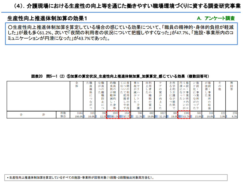 ▽生産性向上推進体制加算を算定している場合に感じている効果としては、「職員の精神的・身体的負担が軽減 した」が最も多く61.2%、次いで「夜間の利用者の状況について把握しやすくなった」47.7%、「施設・事業所内のコミュニケーションが円滑になった」43.7%
