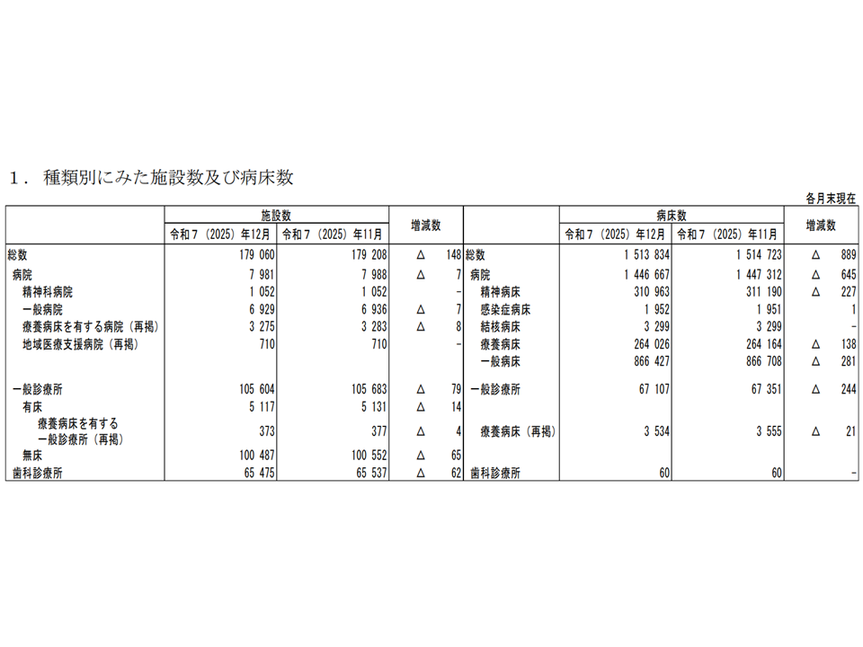 厚生労働省が2月27日に公表した医療施設動態調査(2025年12月末概数)から、こうした状況が分かりました(厚労省のサイトはこちら)。