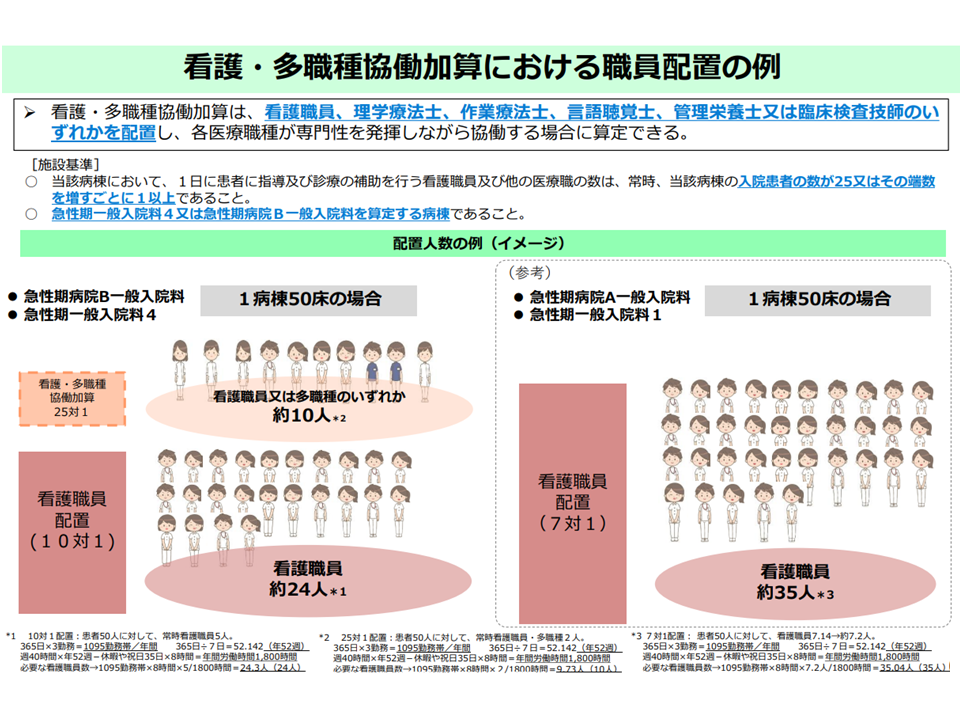 1病棟50床の場合、多職種7対1実現には「看護師24人+多職種10人」の配置が必要