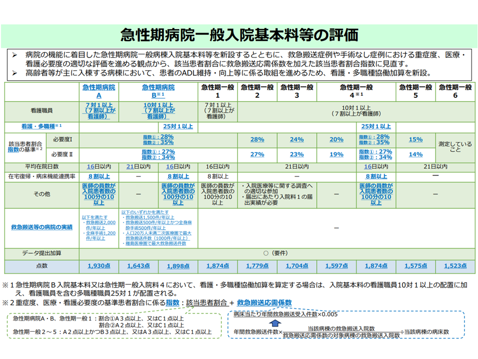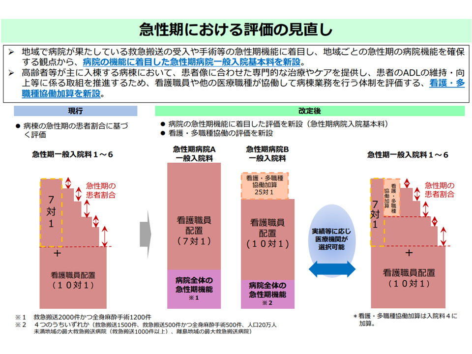 今回は、新設された「急性期病院一般入院基本料」(急性期A・B)と「看護・多職種協働加算」について眺めてみます(関連記事はこちら)。