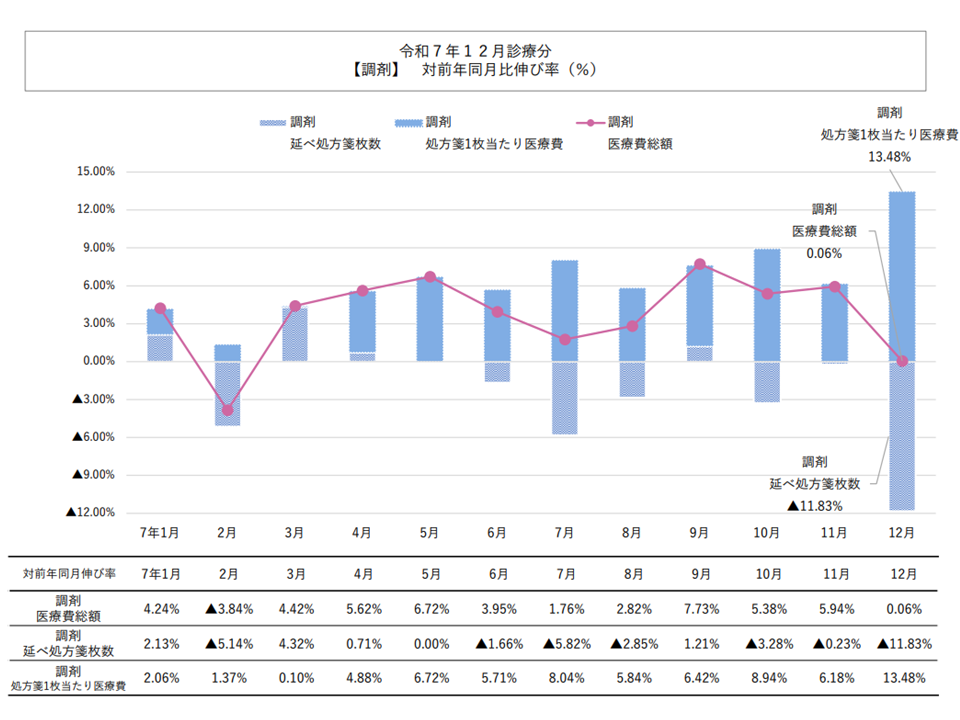 なお昨年(2025年)12月には「医科入院外と、それに続く調剤」(医療機関の外来等を受診し、その後、院外の保険薬局で調剤を受ける)において、延べ患者数が前年同月(2024年12月)から1割程度減少している」点が気になります。今後の詳しい分析と、状況把握に期待が集まります。