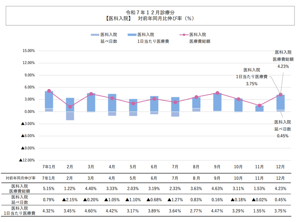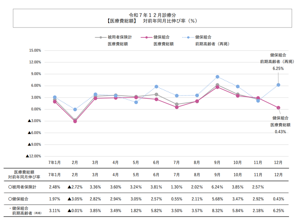2025年12月、健保組合の医療費は前年同月比で0.43%増加した(健保組合医療費(25年11月・12月)1 260303)
