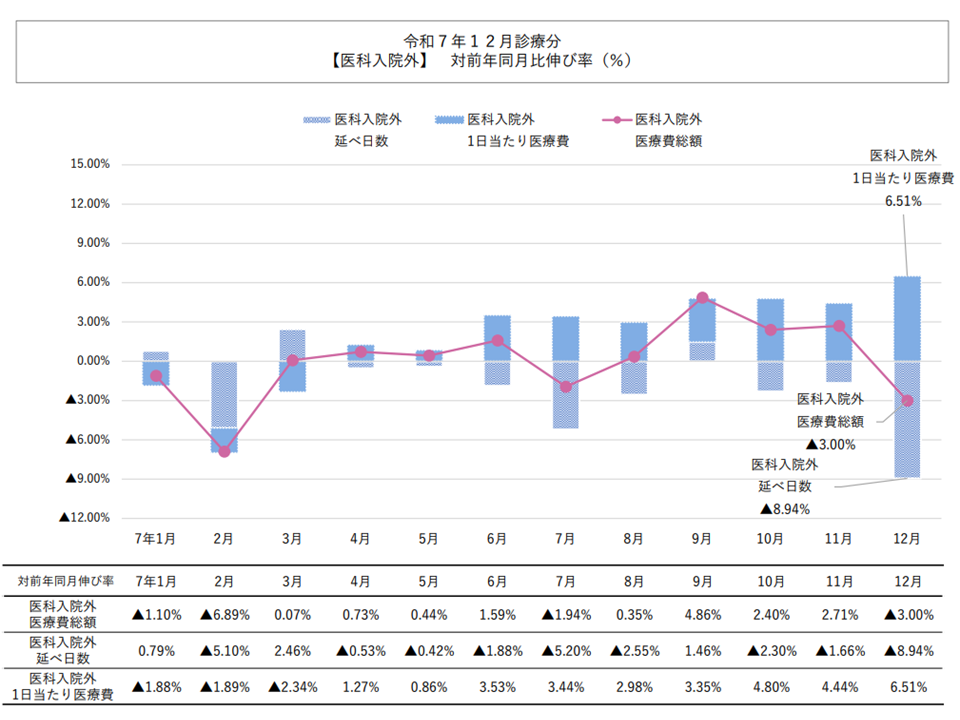 2025年12月、医科入院外・調剤で延べ患者数が前年同月比で1割程度「減少」