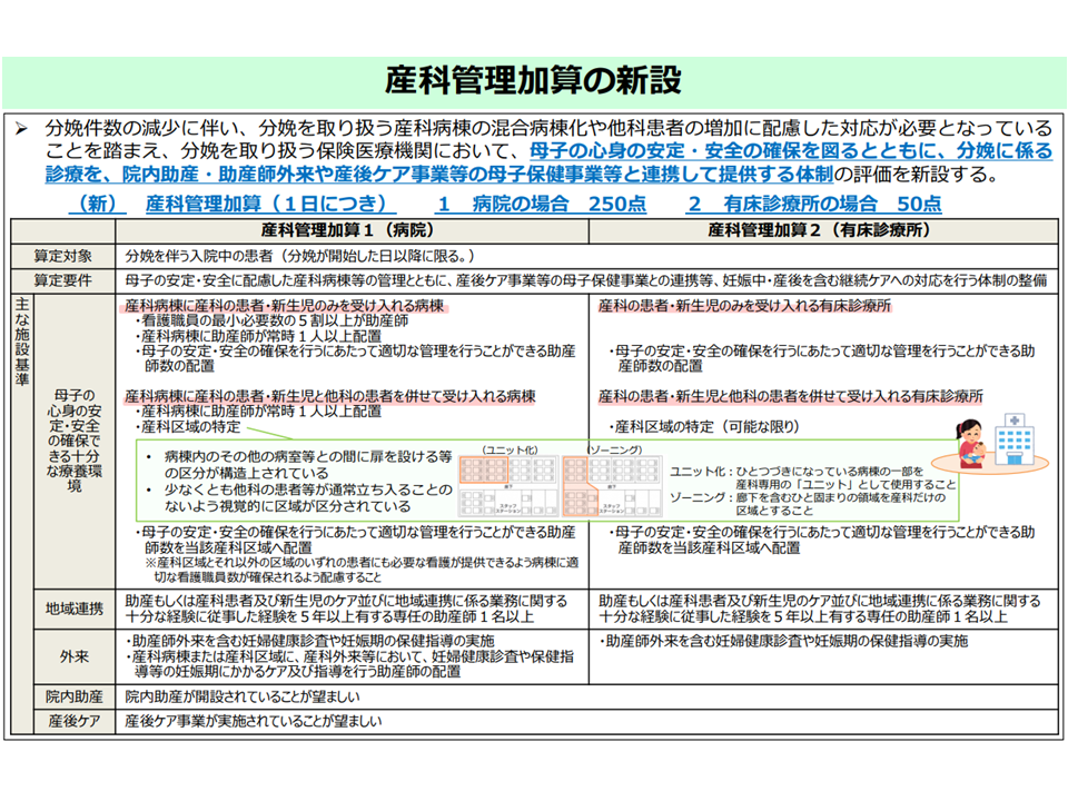 「母子の心身の安定・安全に配慮した」産科病棟を、【産科管理加算】(病院250点、有床床50点)で新たに評価