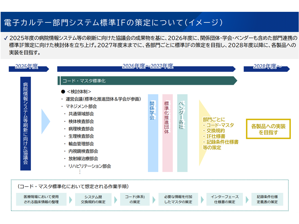 ▽来年度(2026年度)に、関係団体・学会・ベンダーも含めた「部門連携の標準インターフェイス策定に向けた検討体」を立ち上げ、2027年度末までに「部門ごとの標準インターフェイスの策定」を目指し、2028年度以降に「各製品への実装」を目指す