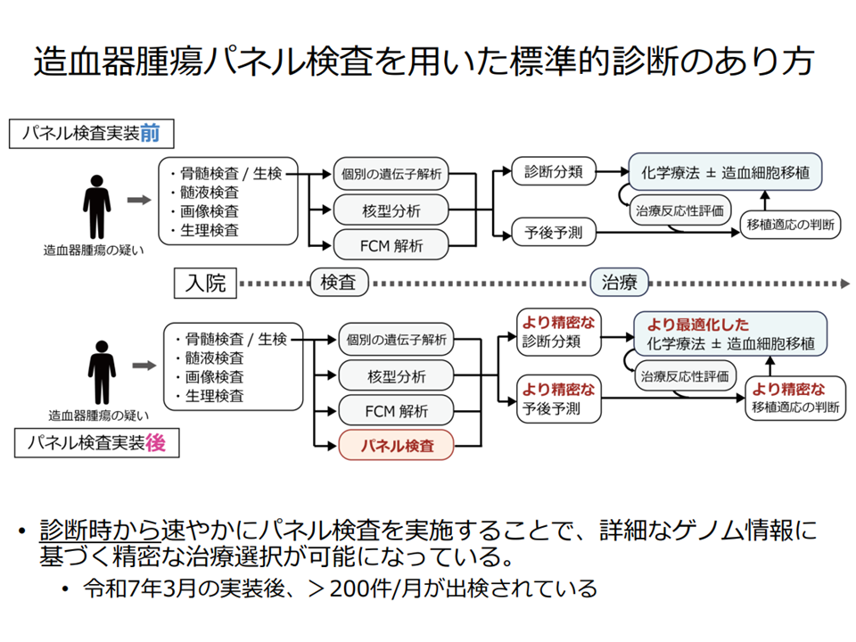 造血器腫瘍遺伝子パネル検査の保険適用により、より精緻な診断・治療法選択・移植選択が可能になっている(がんゲノム拠点病院指定要件WG5 260313)