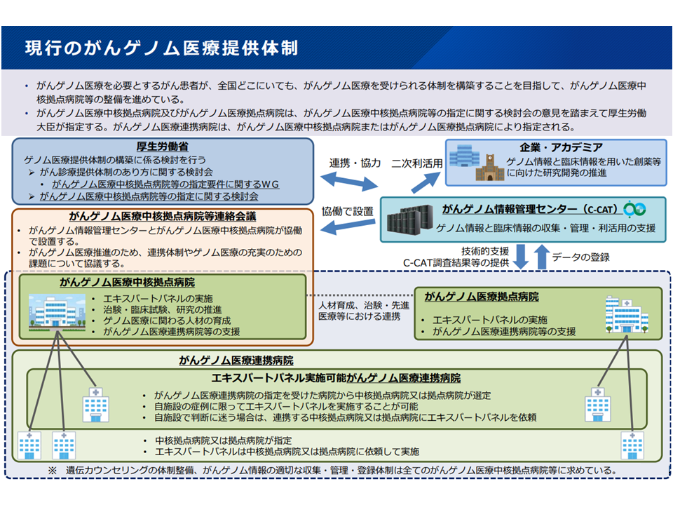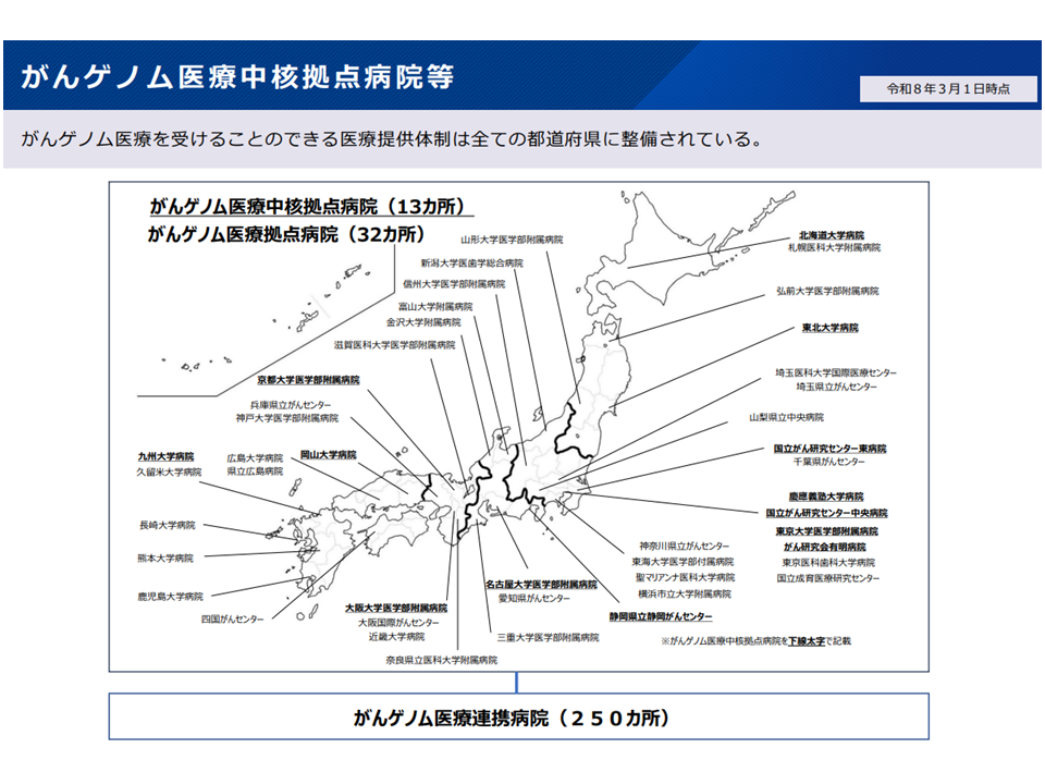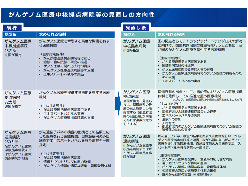 がん患者の遺伝子情報・臨床情報をもとに「最適な抗がん剤」を選択・投与する【がんゲノム医療】を、より身近な医療機関で受けられるようにするために、「がんゲノム医療拠点病院を全都道府県に1か所以上整備する」「がんゲノム医療連携病院について、がん診療連携拠点病院以外でも指定を可能にする」ことなどを検討してはどうか―。