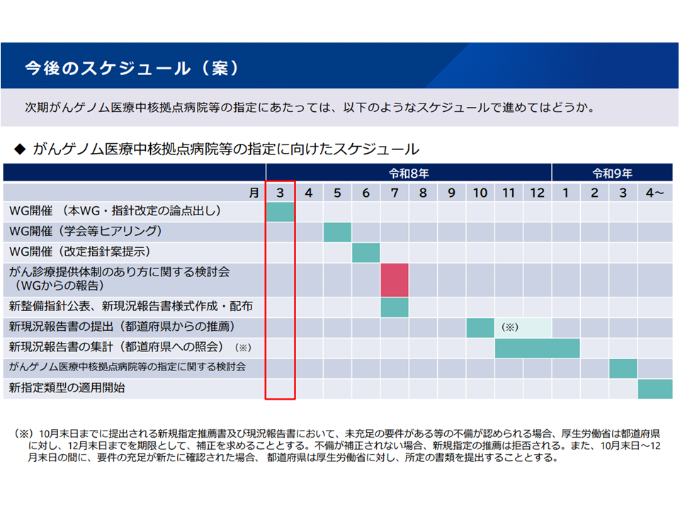 がんゲノム医療中核拠点病院・拠点病院・連携病院の見直しスケジュール(がんゲノム拠点病院指定要件WG6 260313)