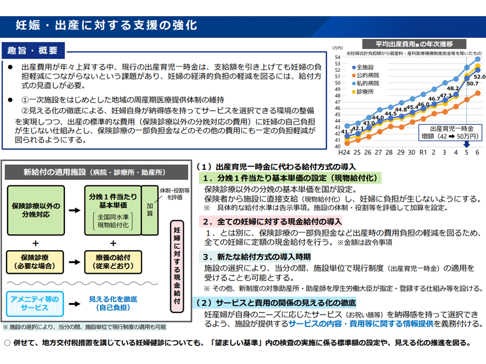 ▽「一次施設(産科クリニック等)をはじめとした地域の周産期医療提供体制の維持」「サービス・費用の徹底した見える化により、妊婦自身が納得感を持ってサービスを選択できる環境の整備」を実現しつつ、▼出産の標準的な費用(保険診療以外の分娩対応の費用、いわゆる正常分娩の費用)を現物給付化(全国一律の基本単価を国が定め、医療保険から医療機関に直接支払う)し、妊婦に自己負担が生じない仕組みとする▼別に、すべての妊婦に一定の現金給付を行い、保険診療部分(分娩の伴う医療行為等)の一部負担金(3割負担)などの費用に充て、一定の負担軽減を図る―こととする