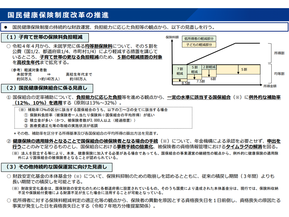 ▽国民健康保険制度の見直し(子育て世帯の保険料負担軽減など)