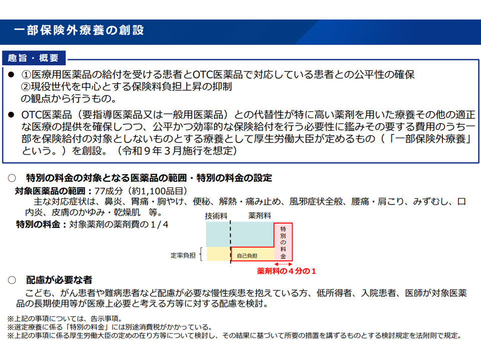▽「医療用医薬品(OTC類似薬)の給付を受ける患者」と「OTC医薬品(一般用医薬品)で対応している患者」との経済的負担の公平性(一般に前者<後者)、現役世代を中心とする医療保険料負担上昇の抑制のため、「OTC医薬品(要指導医薬品または一般用医薬品)との代替性が特に高い薬剤」を用いた場合、費用の一部(OCT類似医薬品の4分の1を想定)を保険給付の対象としない仕組み(新たな「一部保険外療養」制度)を創設する