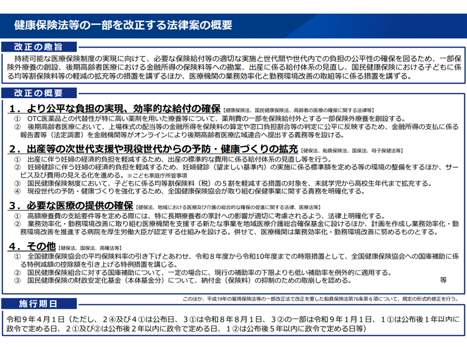 多様な観点での意見が出されており、改正法成立後の詳細を詰める論議やその後の運用、さらに今後の医療保険制度改革の中で、こうした意見も踏まえた対応が検討されていくことになるでしょう。
