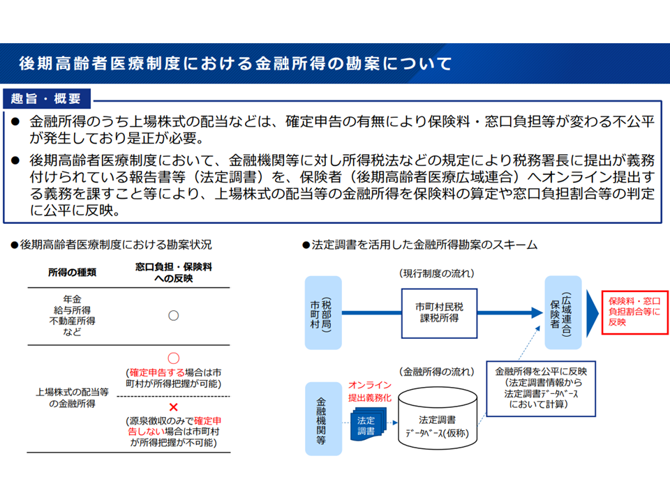 →金融機関等に対し「税務署長に提出が義務付けられている報告書等」(法定調書)を、後期高齢者医療広域連合へオンライン提出する義務を課すし、上場株式の配当等の金融所得を保険料の算定や窓口負担割合等の判定に公平に反映する