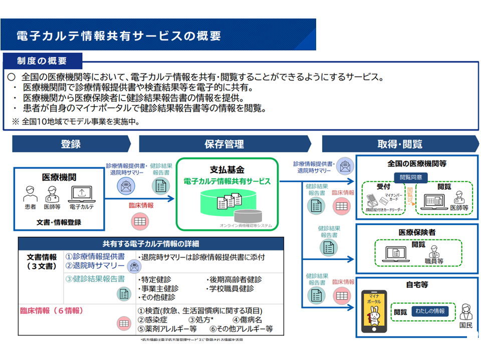 電子カルテ情報共有サービスでは、▼3文書(診療情報提供書、退院時サマリ、健康診断結果報告書)▼6情報(傷病名、アレルギー情報、感染症情報、薬剤禁忌情報、検査情報(救急及び生活習慣病)、処方情報)—について形式の標準化を行い、医療機関等から支払基金等の「電子カルテ情報共有サービス」に【登録】等し、必要に応じて全国の医療機関等や患者自身が【閲覧】を可能とします。現在、モデル事業が行われており、そこで明らかになった課題等への対応を行った後、来年度(2026年度)の冬頃(2027年1、2月頃)をメドに「全国展開」(本格運用の開始)を目指すスケジュールが描かれています(関連記事はこちら)。