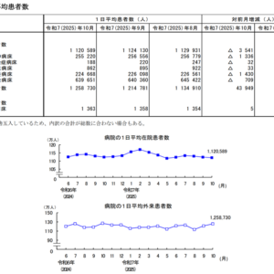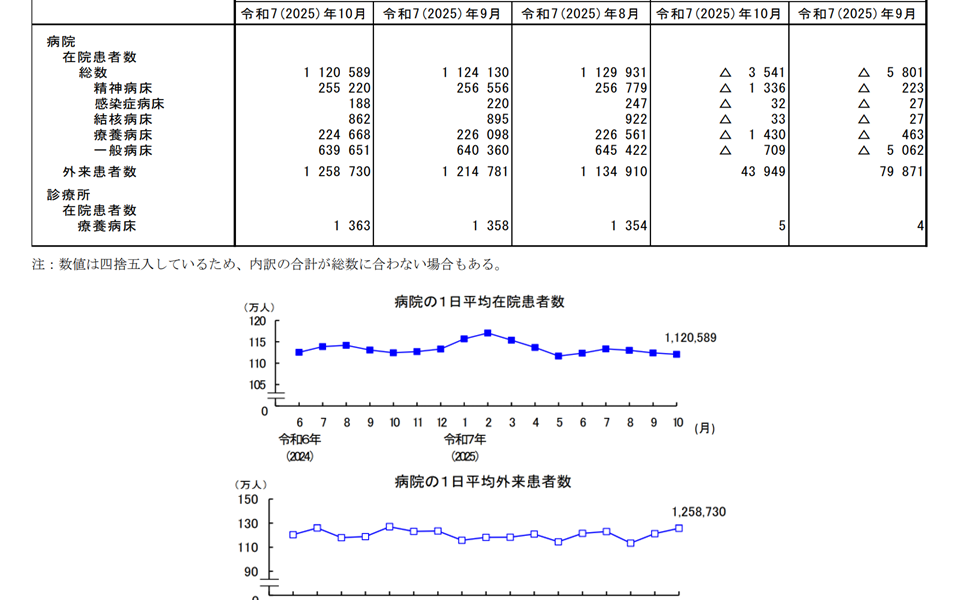 2025年10月の病院患者数はコロナ禍前(2019年10月末)と比べて入院8.1%減・外来6.9%減、患者は病院に戻らず—病院報告